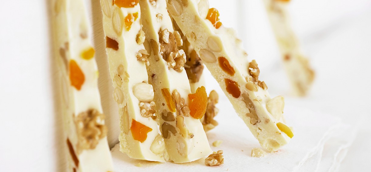 • Sesekljano belo čokolado damo v kozico, ki smo jo postavili nad lonec, v katerem nežno vre voda (vodna kopel). Mešamo, da se stopi do gladkega. Vmešamo pražene mandlje, narezane suhe marelice, orehe in ingver. Dobro premešamo, da se sestavine enakomerno razporedijo.