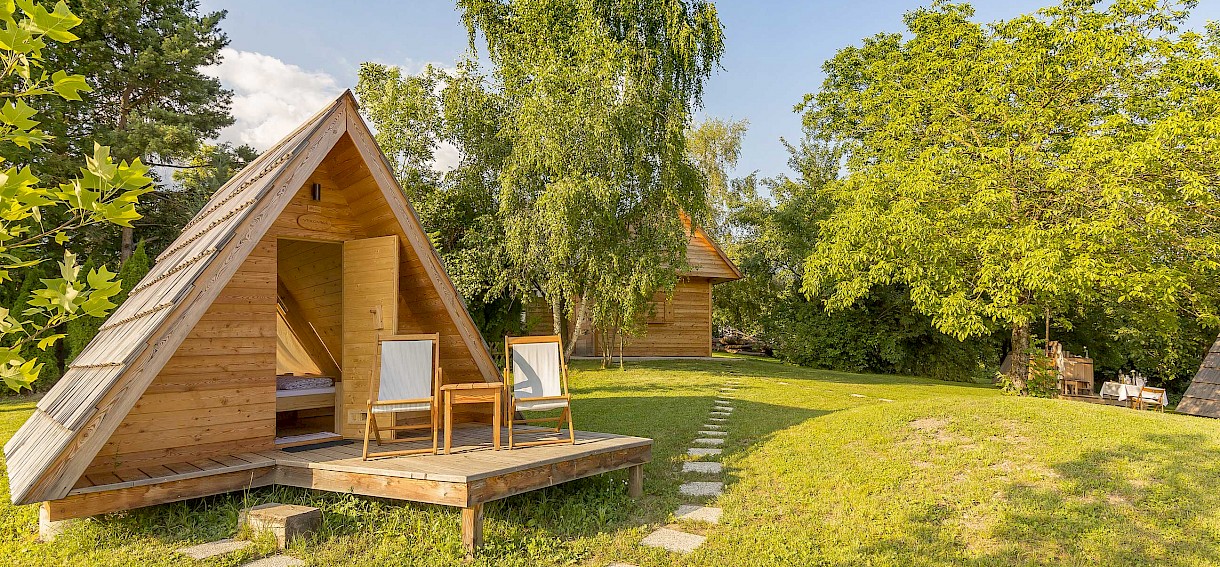 Septembrska jutra so v parku Gostilne Pr' Bizjak posebej romantična. Sončni žarki so postali nežnejši in tudi ob ribniku z mostičkom se narava odeva v jesenske barve. V daljavi se odpira pogled na Storžič in druge vrhove, ki jih občasno že pobeli sneg. Pred eno od štirih hišk glampinga, ki je na prostranem vrtu ob gostilni zaživel pred tremi leti, goste čaka zajtrk v piknik košarici. Danes je v njej tudi slasten slivov zavitek… Lesene hiške za dva so vse opremljene z elektriko in jih je možno ogrevati, prav tako skupno kopalnico, ki stoji v ločenem lesenem objektu. Gostje si lahko pred svojo hiško privoščijo tudi sproščujoče namakanje v leseni kadi, napolnjeni s toplo vodo.