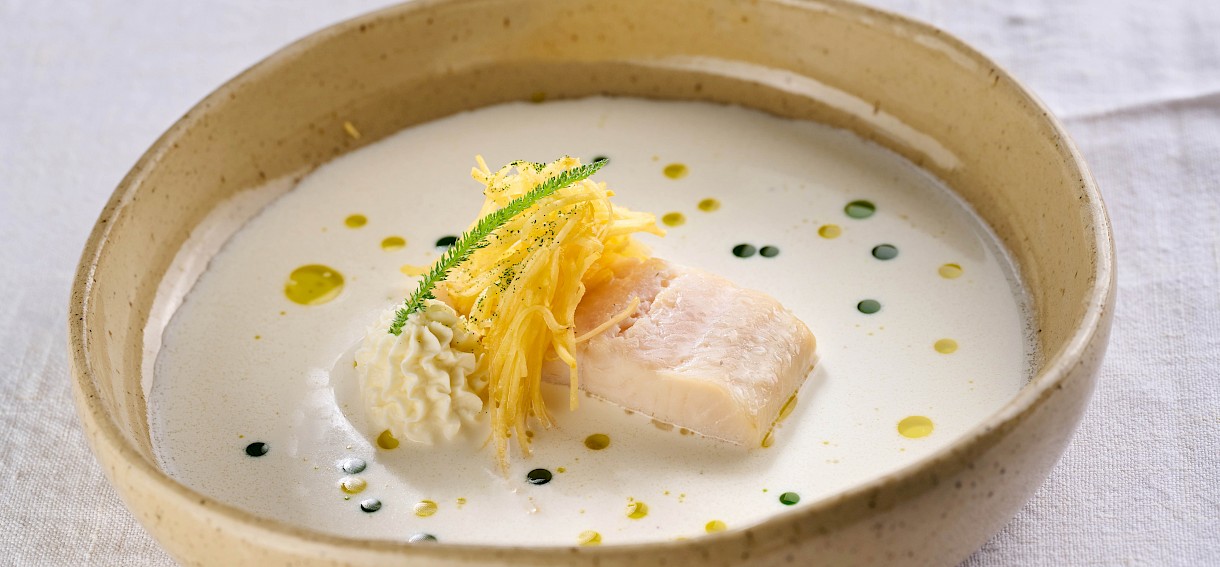 - Postrv s koromačem, porom, krompirjevimi kroketi in omako iz ovčjega camemberta