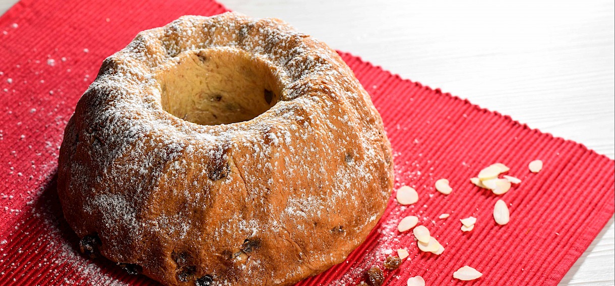 V posodo električnega mešalnika damo obe moki, jajca, sol, sladkor, mleko s kvasom in mešamo v z nastavkom v obliki kljuke toliko časa, da testo odstopi od sten posode. Nato dodamo zmehčano maslo in ko se lepo vmeša, dodamo še rozine. Testo oblikujemo v hlebec in ga pokritega pustimo počivati približno 1 uro, da vzhaja in podvoji maso. Po tem času s prsti in dlanmi iz testa stisnemo pline (samo pritisnemo, ne mesimo). Pustimo ponovno vzhajati, tokrat v hladilniku, približno 1 uro. Nato ponovno stisnemo ven pline in pustimo testo v hladilniku počivati do naslednjega dne. Naslednji dan testo oblikujemo v obliko štruce ali valja. Položimo ga v model oziroma pekač, ki smo ga pred tem namastili z maslom in po dnu potresli mandlje. Še zadnjič pustimo testo vzhajati, tokrat kar na sobni temperaturi, nato ga damo v pečico, ogreto na 170°C. Pečemo približno 35 minut.