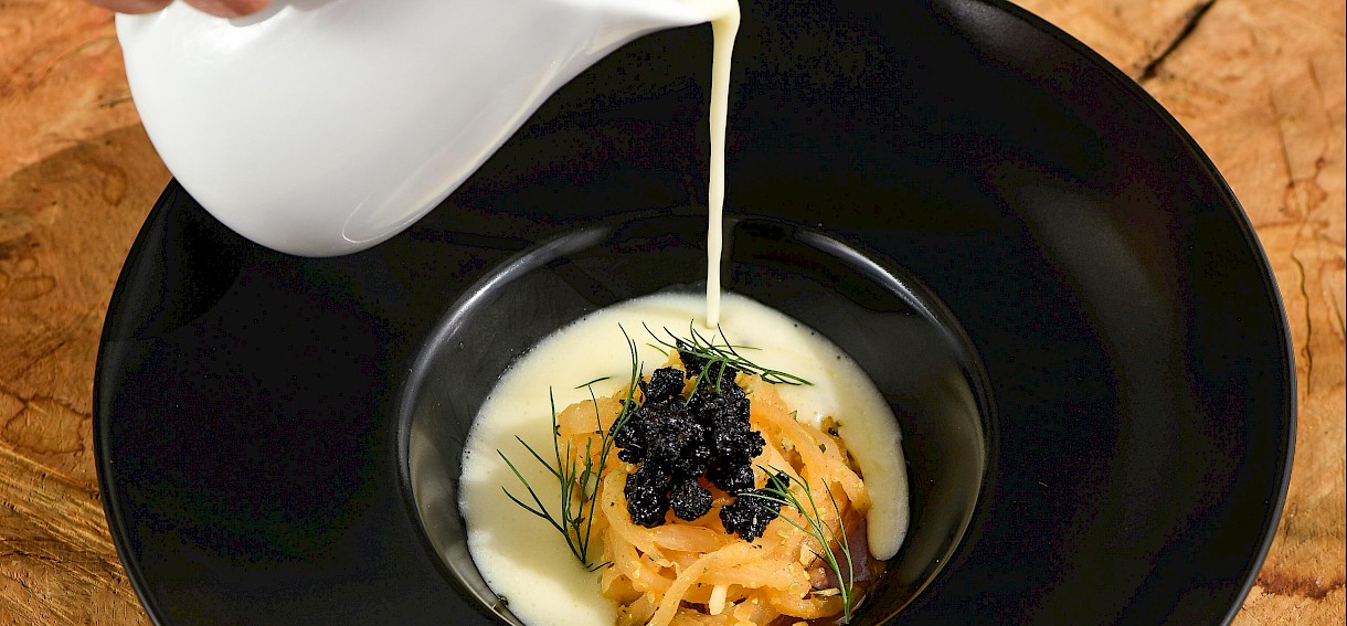 Posip: Klobaso olupimo in nadev zmešamo s sipinim črnilom. Nadrobimo ga v pekač na peki papir in pečemo 20 minut na 200°C, da postane hrustljav.